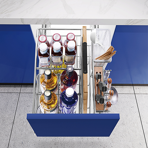 市面上出现的各种橱柜拉篮,并不是每一款都适合自家的厨房,更具家居橱柜的不同造型,选择不同类型和品牌的橱柜拉篮。橱柜拉篮最大的好处在于当柜子的抽屉拉开时,会不尽感叹收纳的极致。尽管物品多而杂,但每样都一层一层地展现在眼前,清新而干净。
